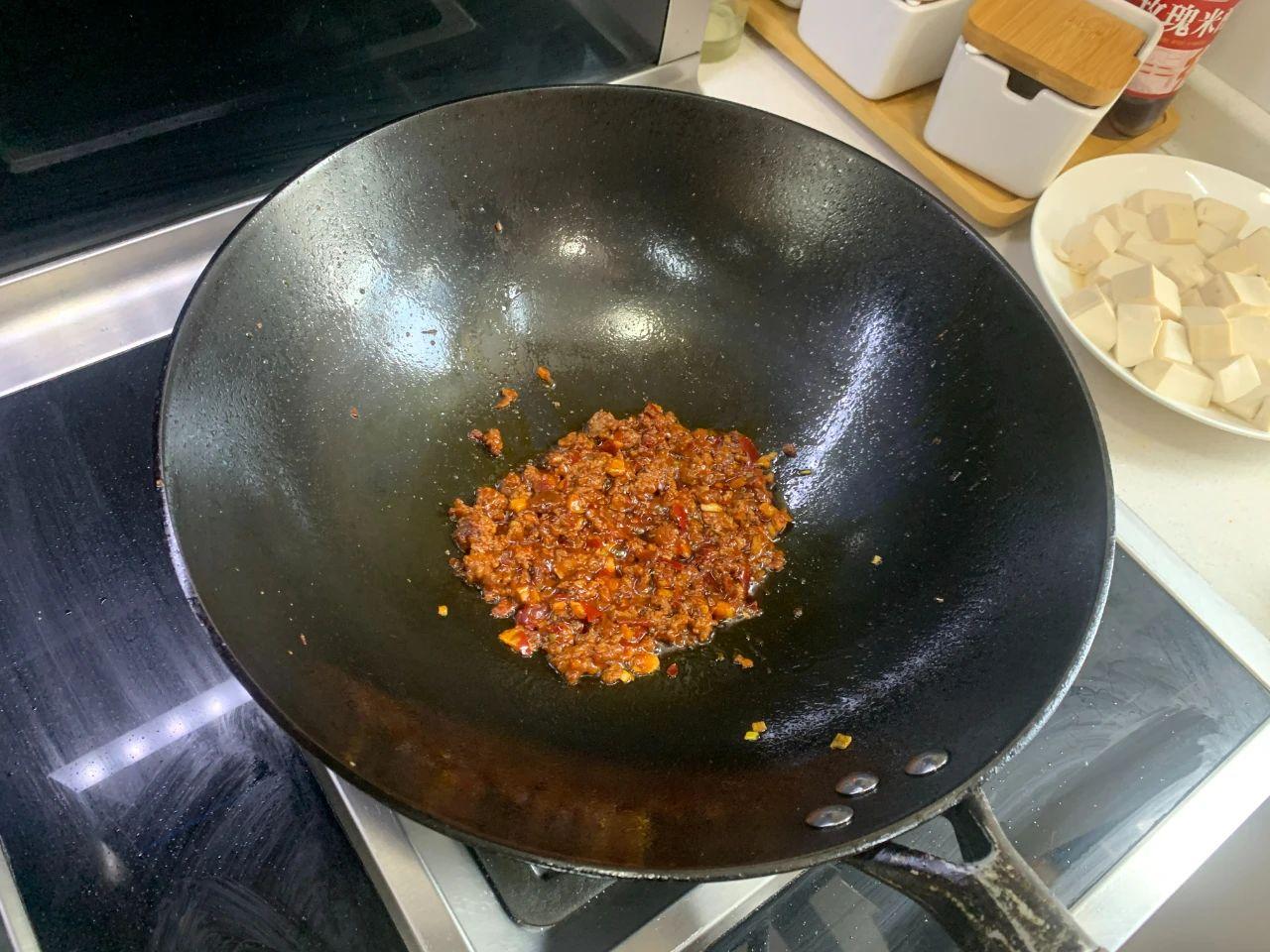 3、起鍋燒油,加蔥姜蒜末炒香,然后放入牛肉煸炒至變色,再加一勺豆瓣醬翻炒出紅油。
