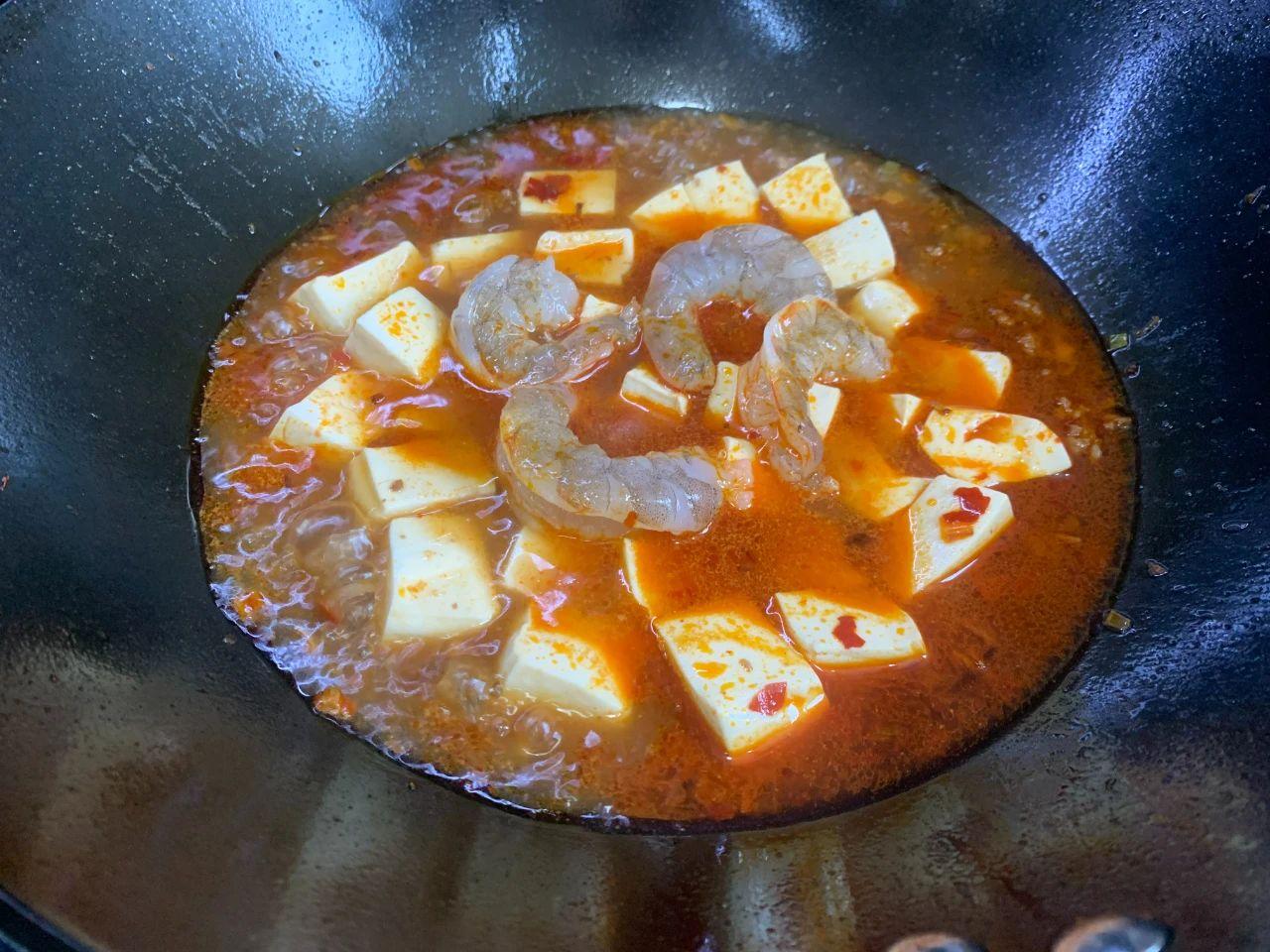 4、倒入適量開水,加醬油、鹽和白糖調(diào)味,再放入豆腐和大蝦,燒開后小火咕嚕5分鐘。