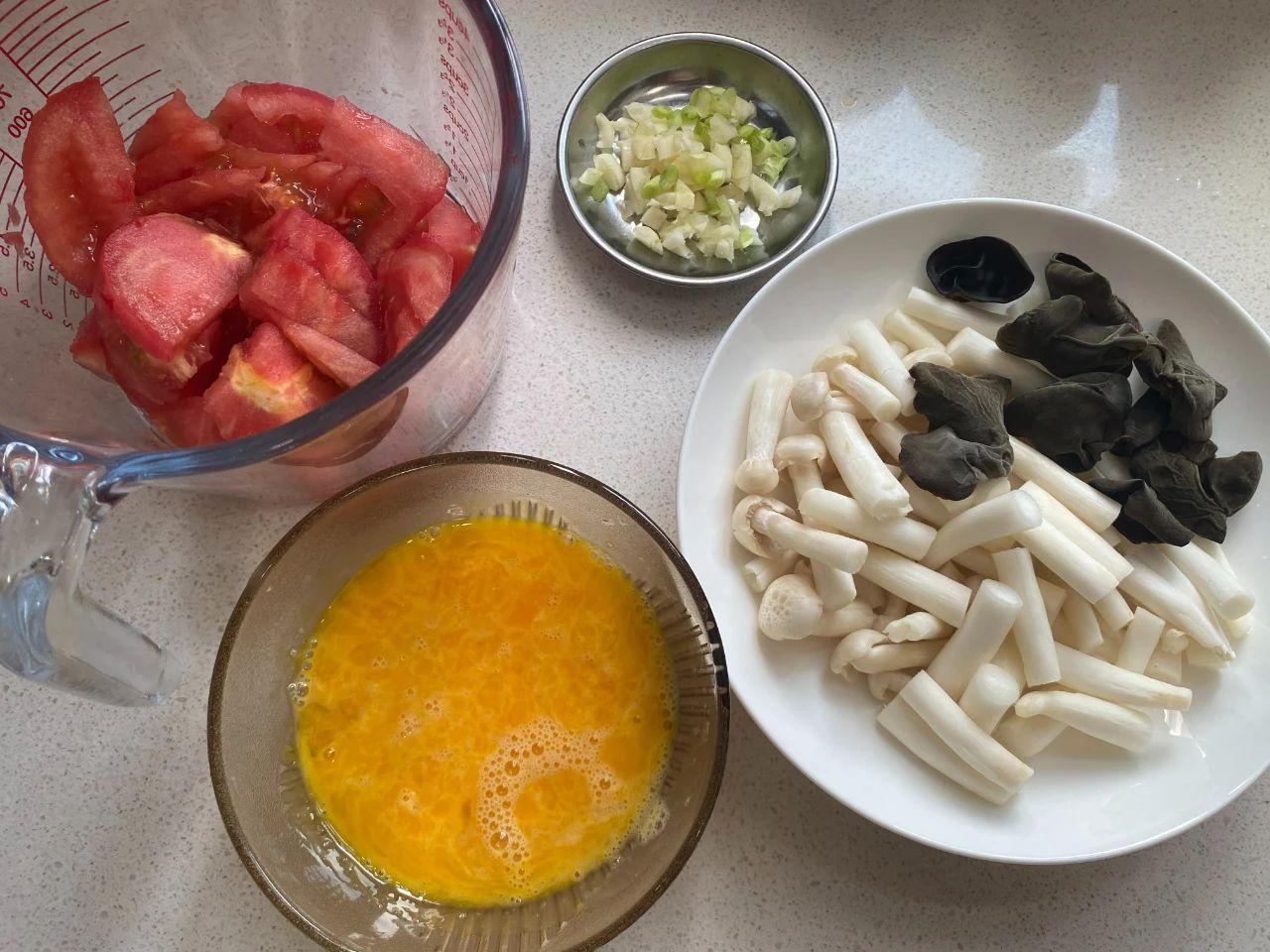 1、番茄去皮切小塊,白玉菇洗凈切段,黑木耳泡發(fā)洗凈,再打個(gè)雞蛋,切點(diǎn)蔥蒜末備用。