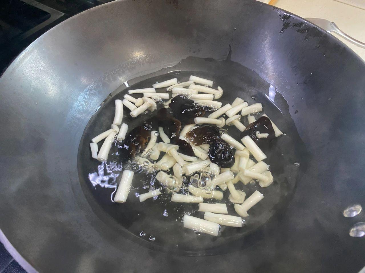 2、鍋中燒開水,放入白玉菇和黑木耳焯水,煮熟后撈出,瀝干水分備用。