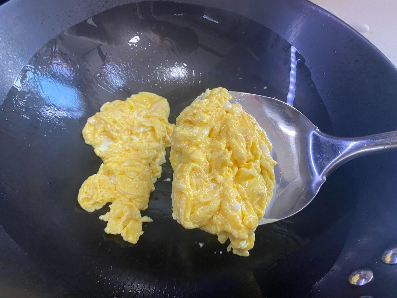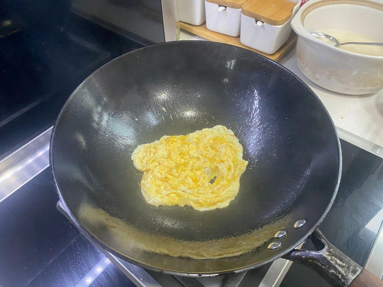 3、起鍋燒油,先倒入雞蛋液,加熱至雞蛋液凝固,然后出鍋備用。