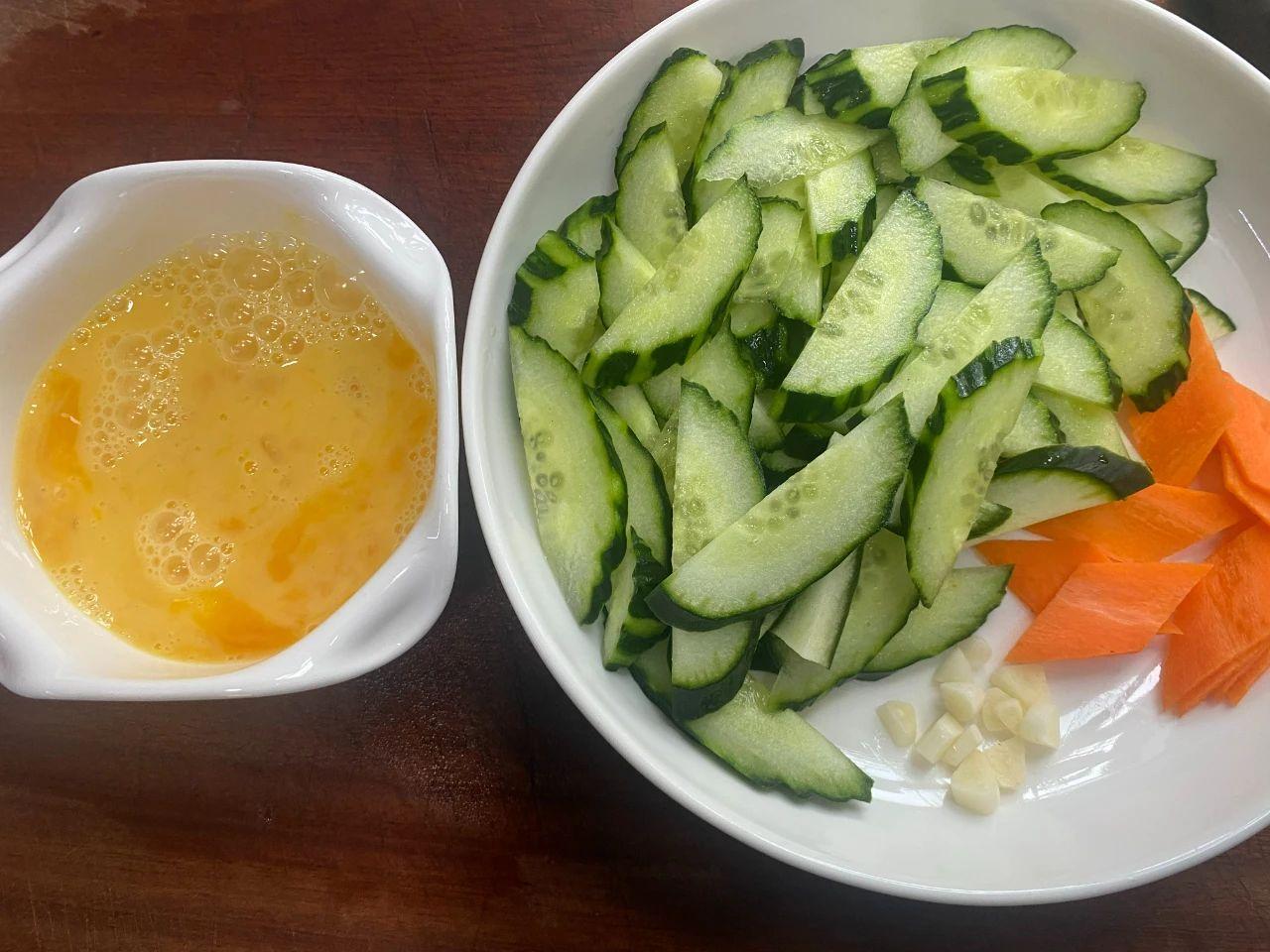 1、黃瓜去皮切片,再切點(diǎn)蒜片和胡蘿卜片,打2個(gè)雞蛋,加點(diǎn)鹽和料酒攪拌均勻。