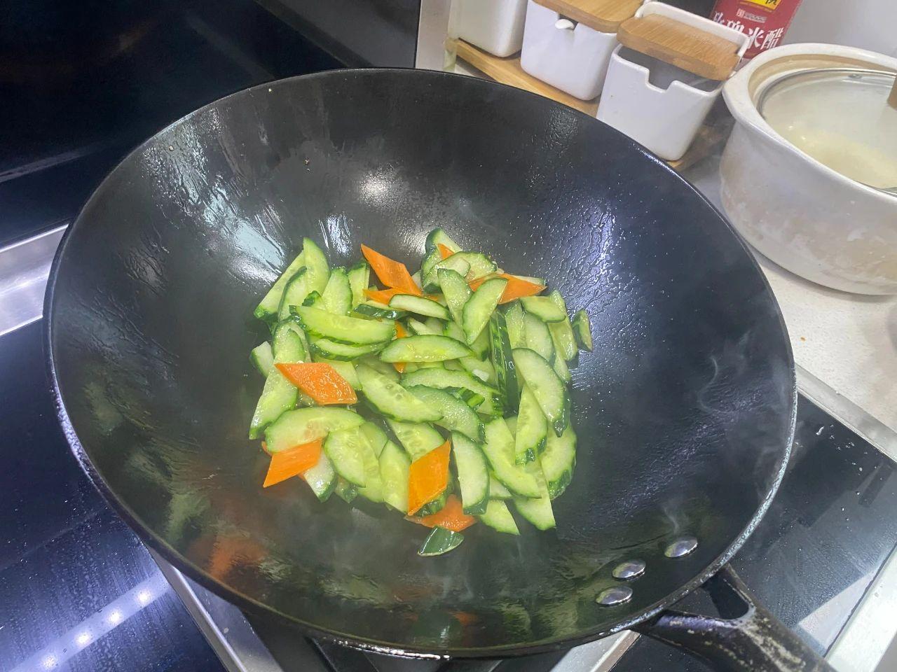 3、鍋中再加少許油,放入蒜片、黃瓜和胡蘿卜,加勺鹽,炒至斷生。