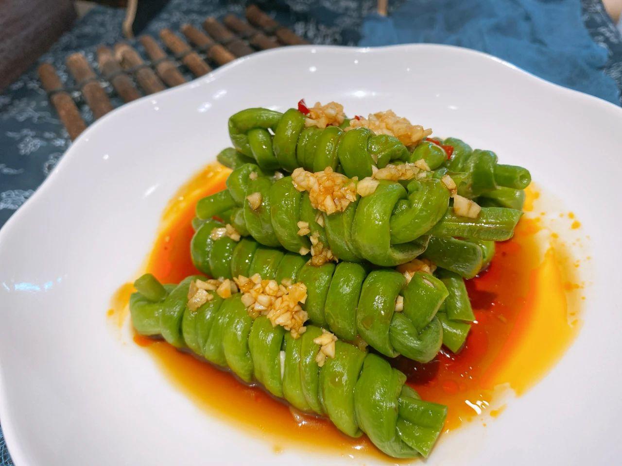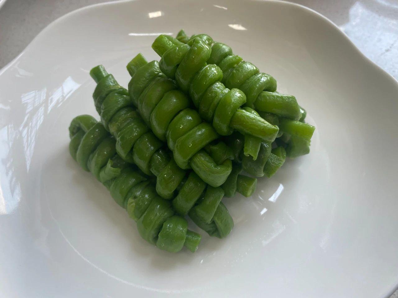 2、豆角煮熟后,過(guò)一下涼水,然后將豆角卷起來(lái),卷成這樣的形狀,擺放盤中。