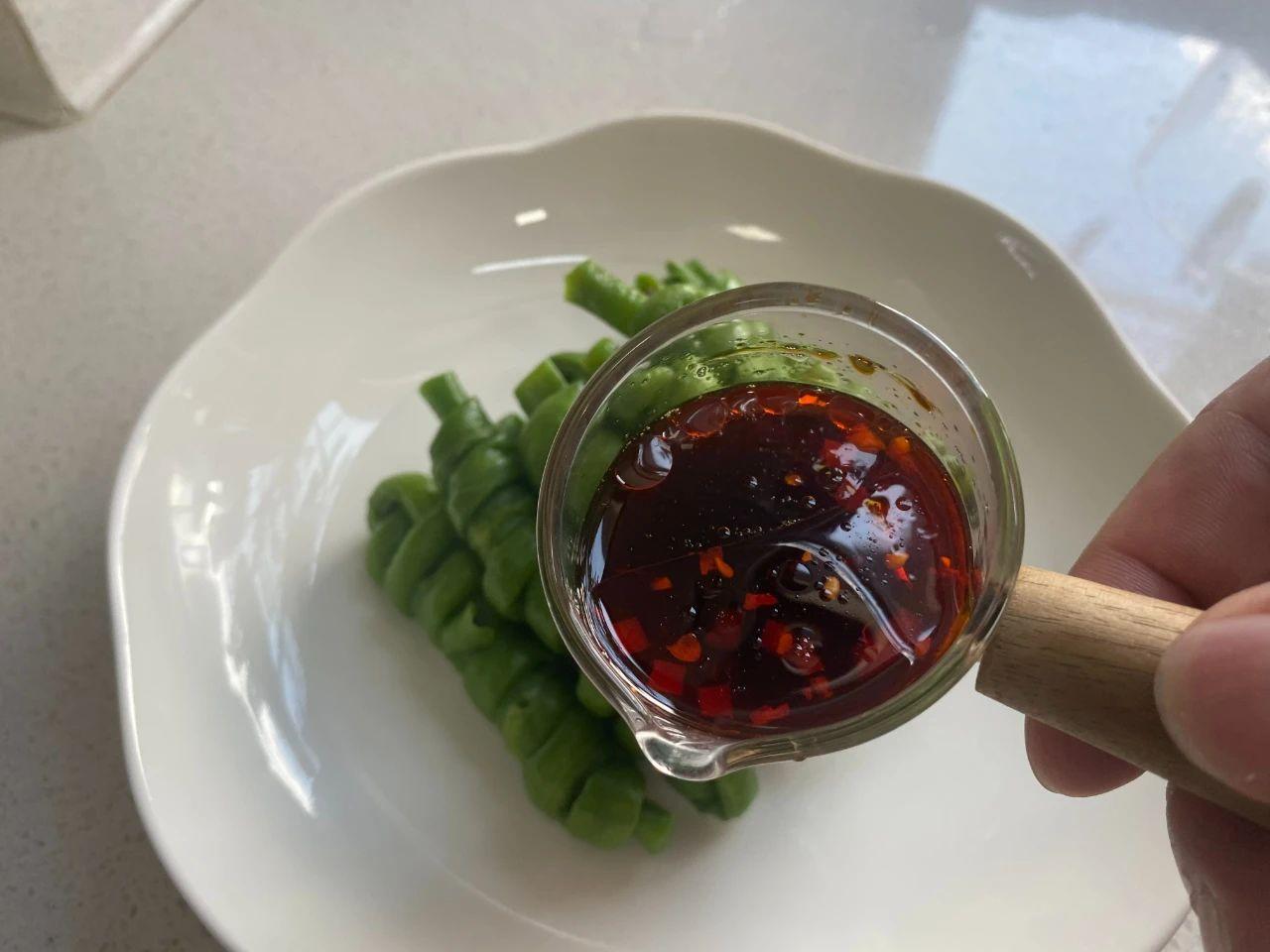 3、適量蒜末、1勺醬油、1勺醋、1勺辣椒油、少許白糖和味精攪勻,最后淋在豆角上面就可以了。