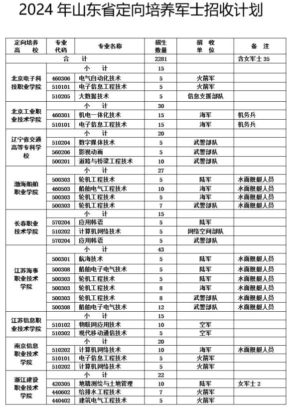 2024年定向士官院校名單及招生計劃完整版如下: