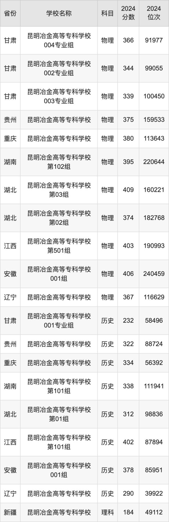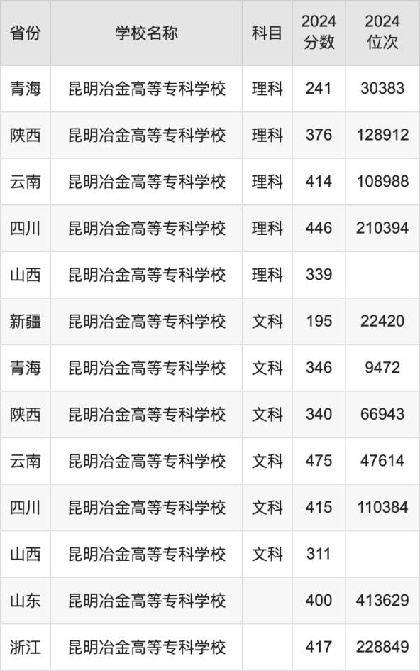 2024昆明冶金高等??茖W校錄取分數(shù)線匯總:全國各省最低多少分能上