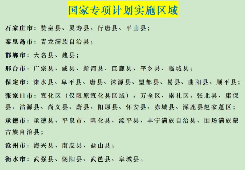 涵蓋了多個(gè)脫貧縣(市、區(qū)),如石家莊市的贊皇縣、靈壽縣等,秦皇島市的青龍滿族自治縣,以及邯鄲市、邢臺(tái)市、保定市、張家口市、承德市、滄州市、衡水市的多個(gè)縣(市、區(qū))。河北省國家專項(xiàng)計(jì)劃的實(shí)施區(qū)域具體如下: