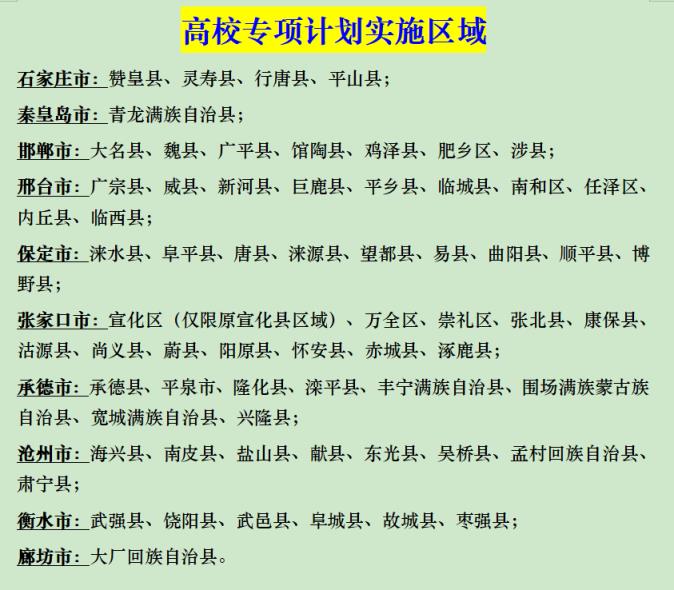 地方專項(xiàng)計(jì)劃在河北省的實(shí)施區(qū)域?yàn)榭h(含縣級(jí)市和自2014年起經(jīng)國務(wù)院批準(zhǔn)的縣(市)改區(qū))。這些地區(qū)涵蓋了河北省內(nèi)的所有縣(市、區(qū)),為當(dāng)?shù)剞r(nóng)村學(xué)生提供了更多的升學(xué)機(jī)會(huì)。