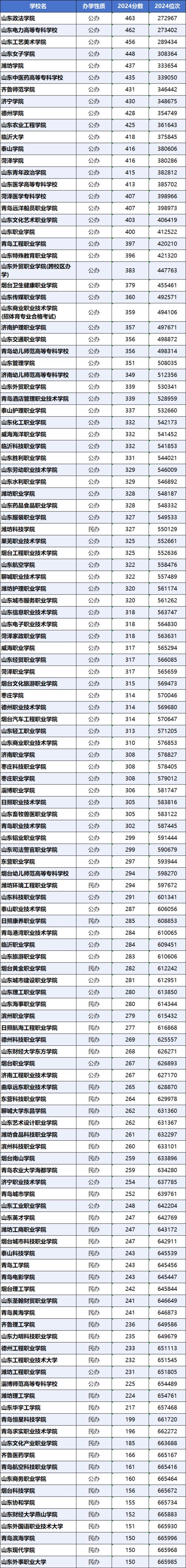 下面展示2024年山東省內(nèi)所有專科大學(xué)(包括在??婆浫〉谋究拼髮W(xué))錄取分?jǐn)?shù)線及其位次!