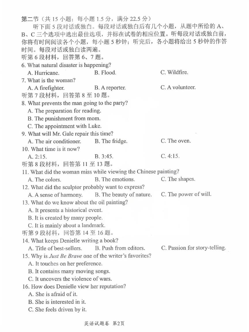 聽力部分:共兩節(jié),第一節(jié)5小題,每小題1.5分,共7.5分;第二節(jié)15小題,每小題1.5分,共22.5分。