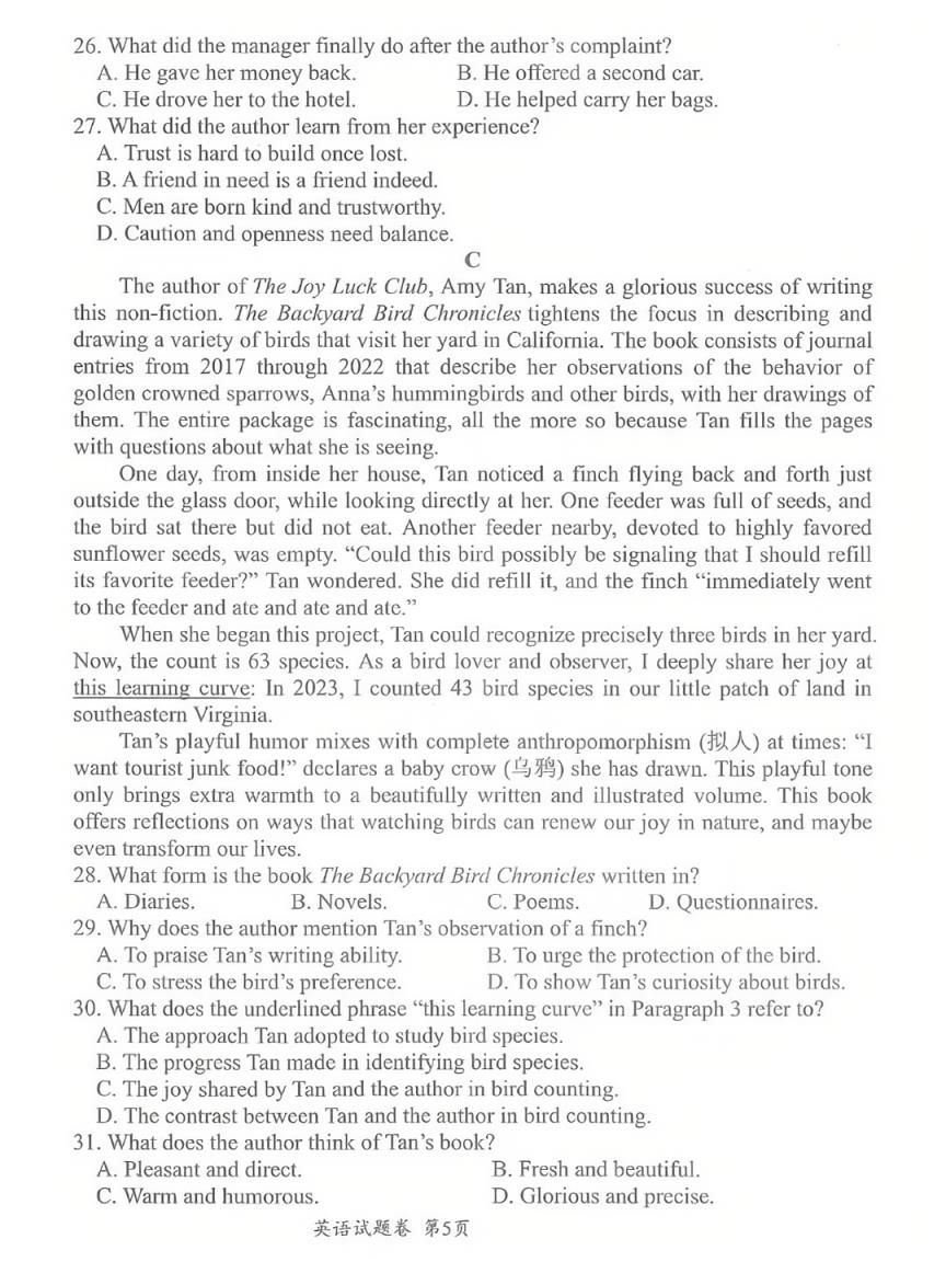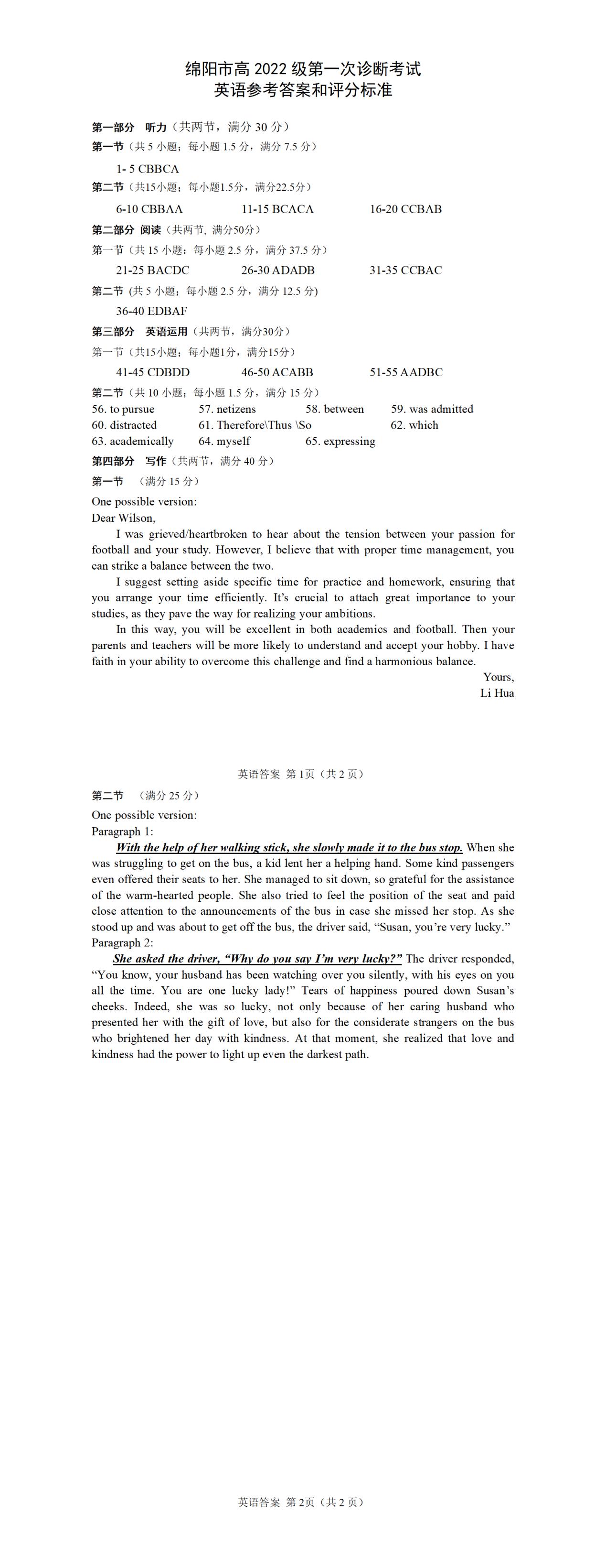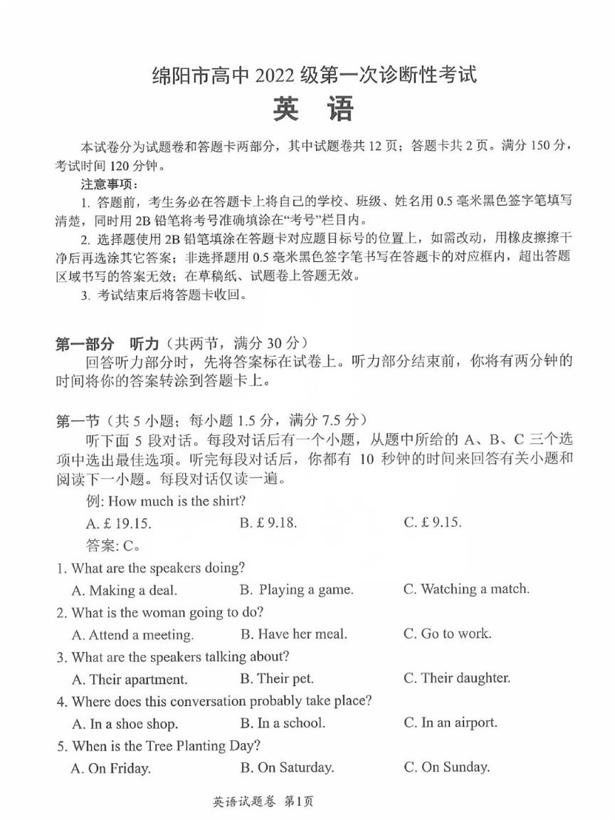 三、2025綿陽市一診考試英語答案
