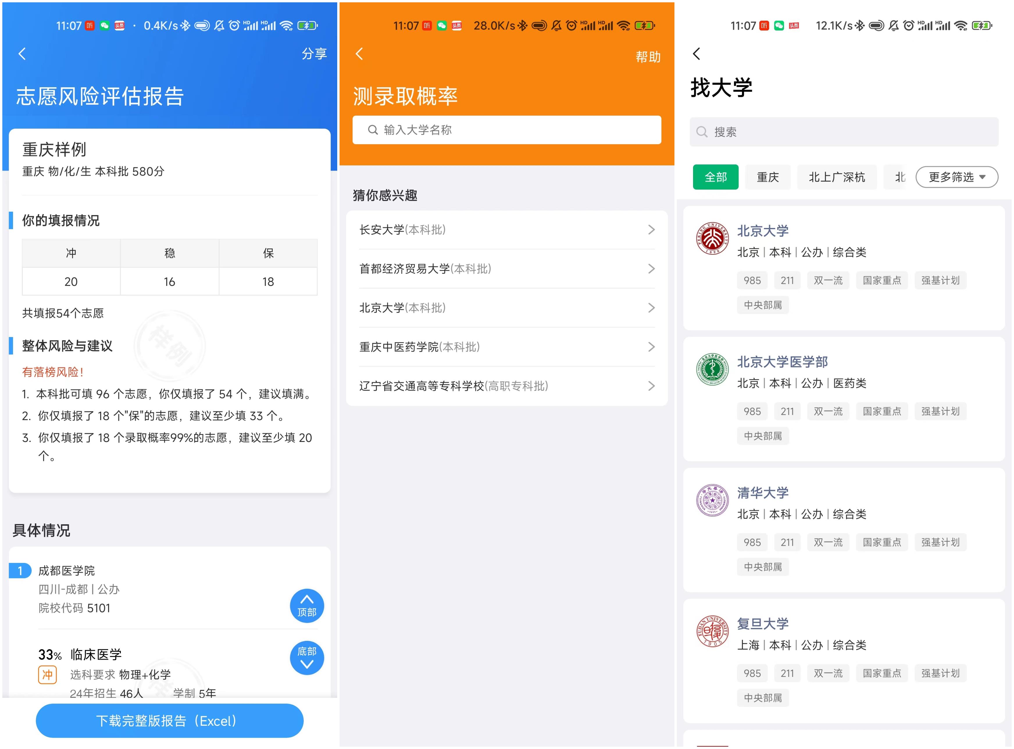 除了分?jǐn)?shù)查詢,APP還為考生提供詳細(xì)的成績分析報(bào)告,幫助考生了解自己在全省或全國的成績排名,評估自己被某所大學(xué)錄取的幾率,進(jìn)而調(diào)整志愿填報(bào)計(jì)劃。