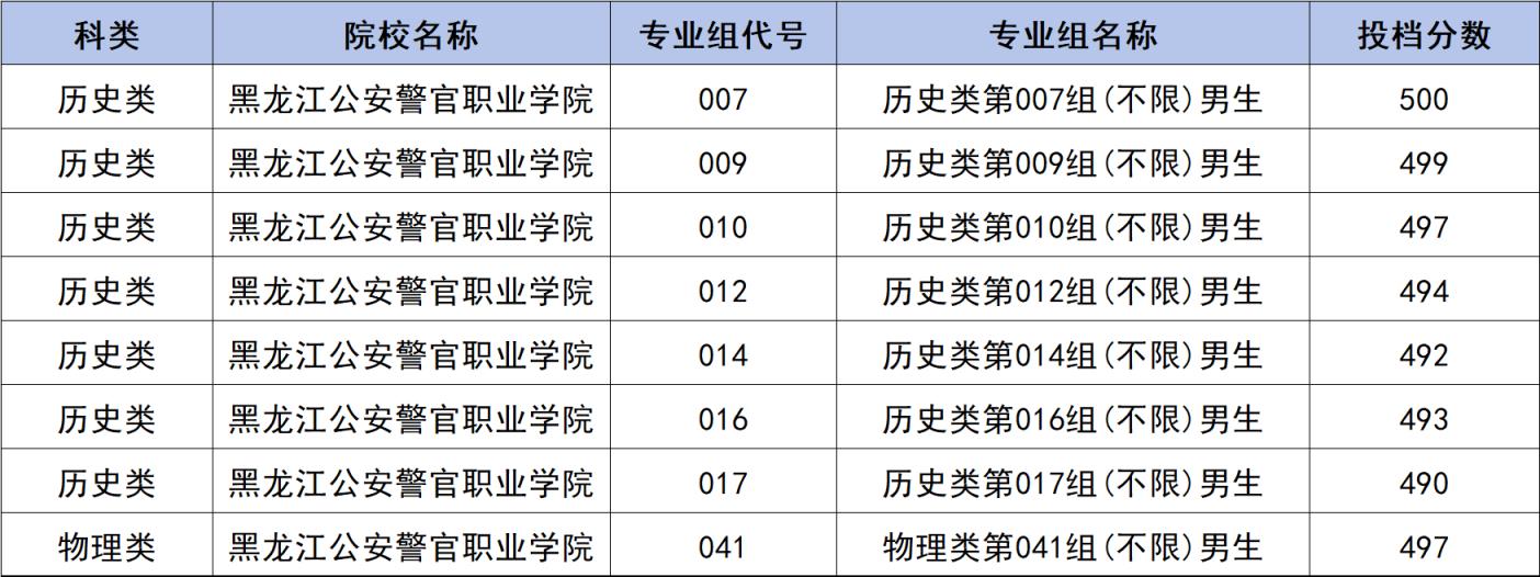2024年該省招生的警校為黑龍江公安警官職業(yè)學(xué)院。這所學(xué)校雖然是專科,但它提前批畢業(yè)生也可以參加公安聯(lián)考,入編入警。該校不會對外招生,每年招收少量的女生(2024年招收50人)。從下圖數(shù)據(jù)來看,學(xué)校的分?jǐn)?shù)線雖然有好幾個專業(yè)組都低于500分,但最多也只低了10分,是分?jǐn)?shù)線比較高的??圃盒?。