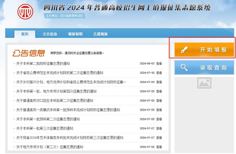 2、進入四川省2024年普通高校招生網(wǎng)上填報征集志愿系統(tǒng),可以看到最新的征集志愿通知,考生可以查看最新的征集志愿填報時間及填報規(guī)則,在規(guī)定的時間內(nèi)點擊開始填報后進入征集志愿的登錄界面。