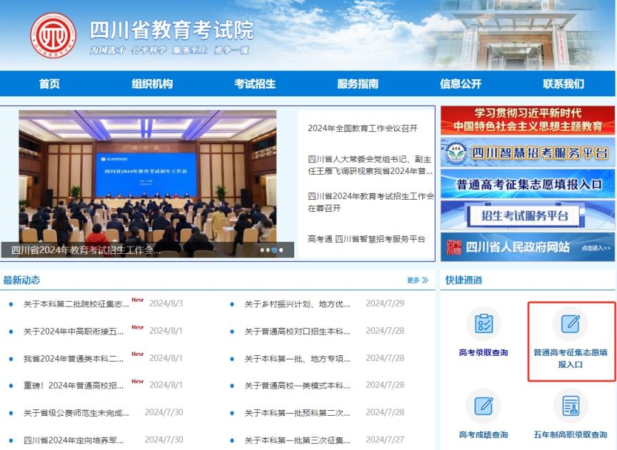 1、進入四川省教育考試院官網(wǎng),在右下角的快捷通道中找到“普通高考征集志愿填報入口”,點擊后進入征集志愿系統(tǒng)頁面。
