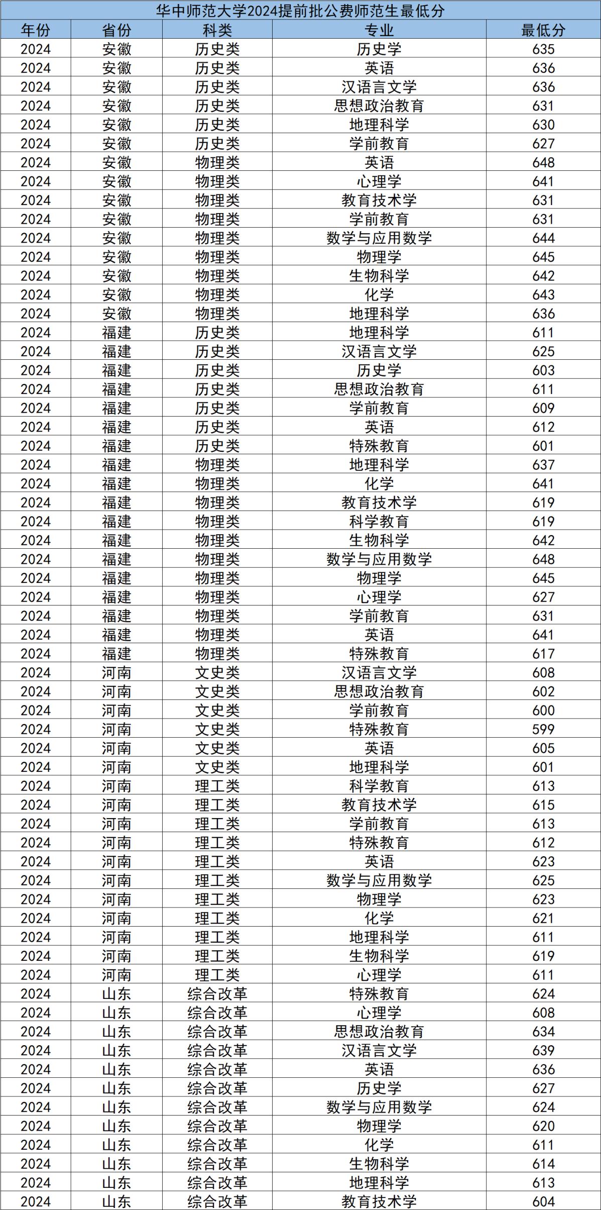 2024年華中師大在部分省份的最低分如下,除特殊教育在河南的文科分低于600之外,其余全部在600分以上,最高可達(dá)到648分。