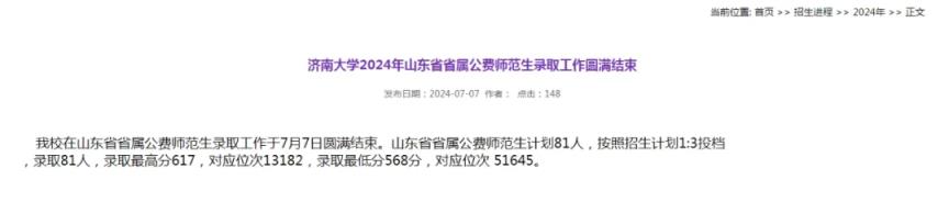 2024年濟南大學省屬公費師范生共計劃招收81人,實際錄取81人,錄取分數(shù)線在568-617分之間,錄取位次在13182-51645之間。