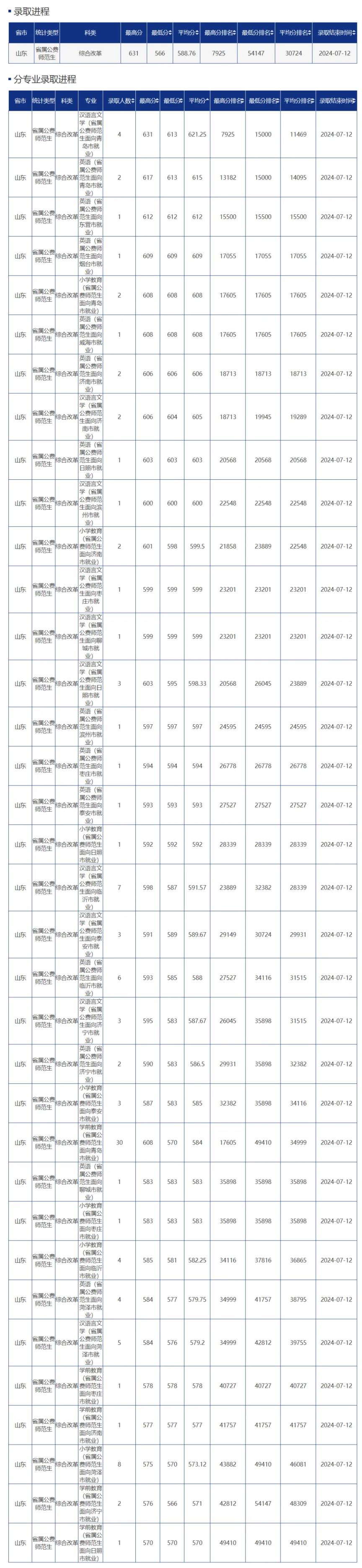 2024年山東省屬公費師范生錄取分數(shù)線(含最低位次)