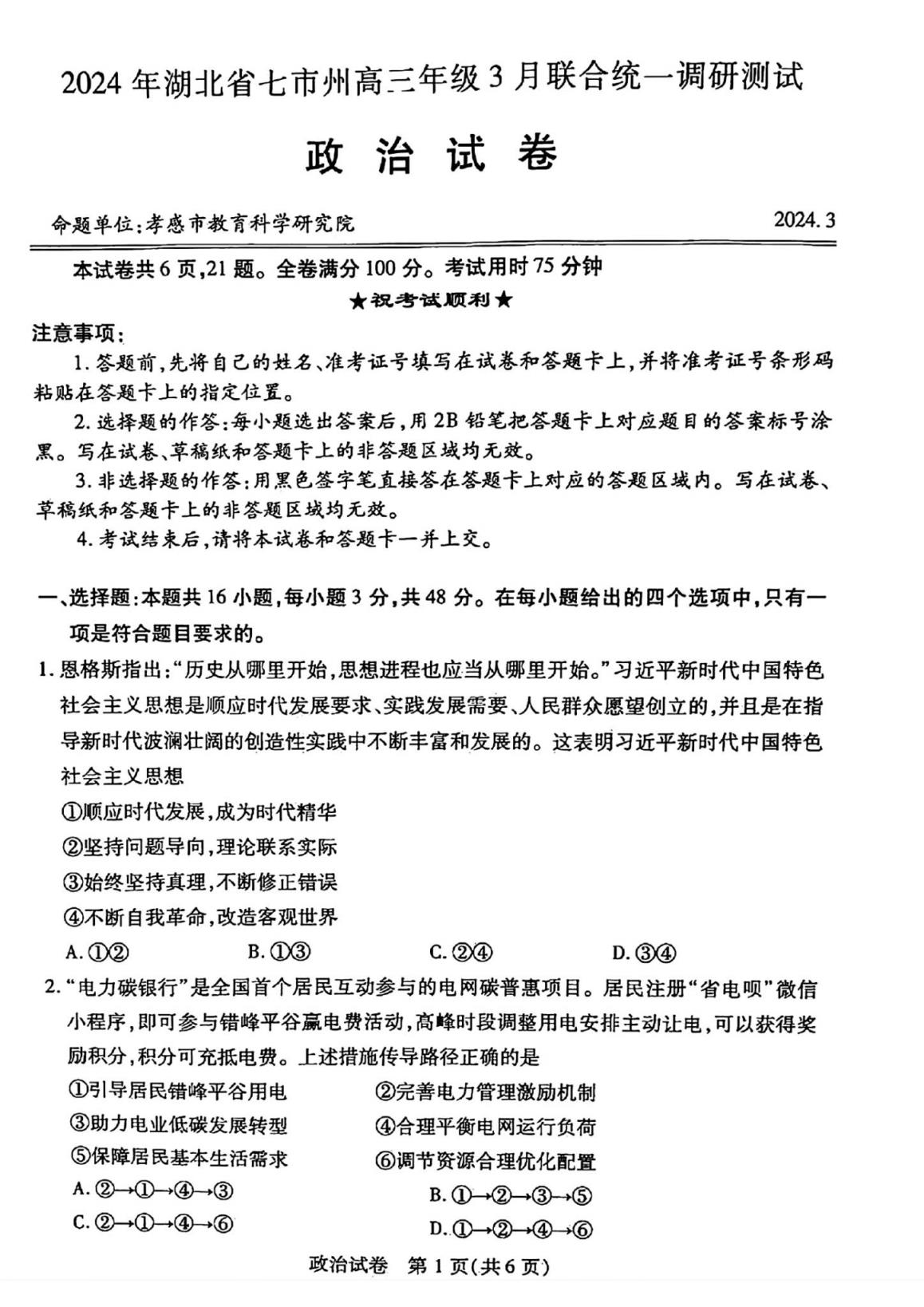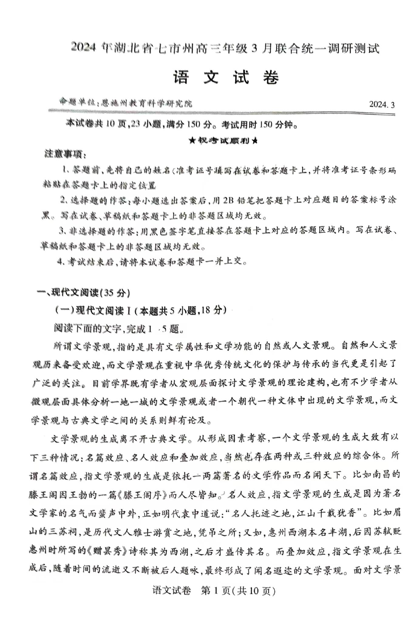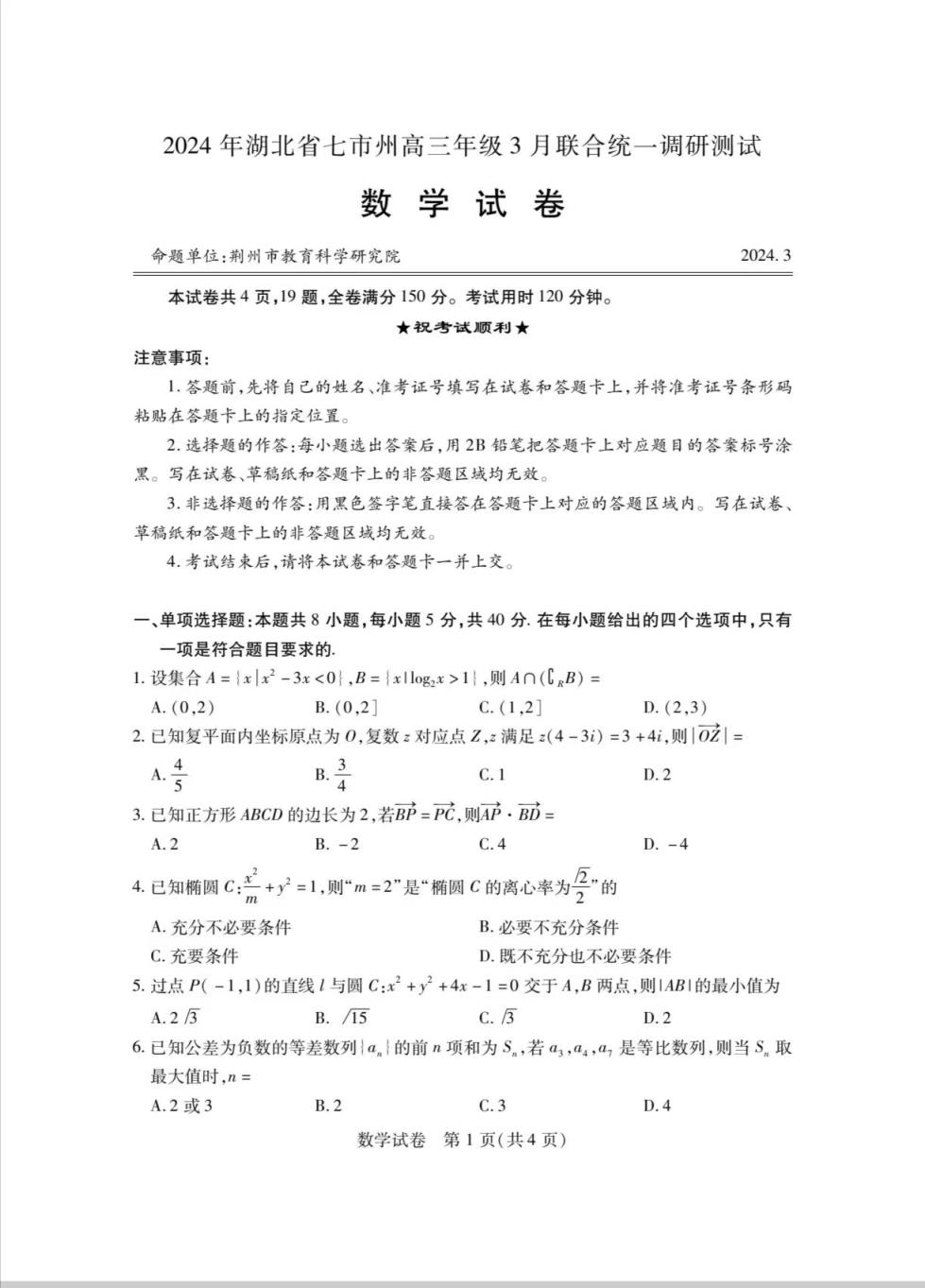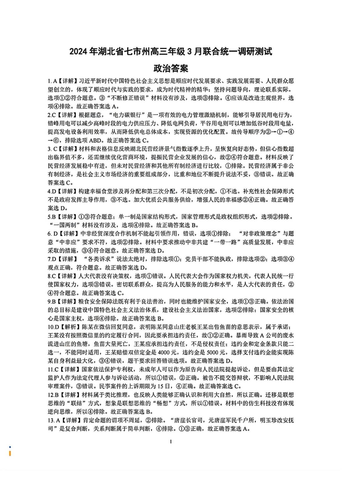一、湖北七市州聯(lián)考2024