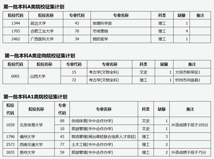 第一批本科A類、A1類院校征集志愿公告(7月27日16:30-28日9:00)