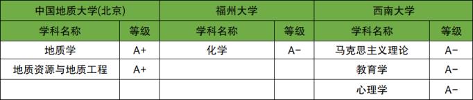 根據(jù)2023年軟科中國(guó)大學(xué)排名,與西南大學(xué)綜合實(shí)力相當(dāng)?shù)姆謩e為中國(guó)地質(zhì)大學(xué)(北京)和福州大學(xué),本文整理了北地、福大、西南大在全國(guó)第四輪學(xué)科評(píng)估中A類(lèi)等級(jí)的學(xué)科,中國(guó)地質(zhì)大學(xué)(北京)獲評(píng)A+的學(xué)科最多。