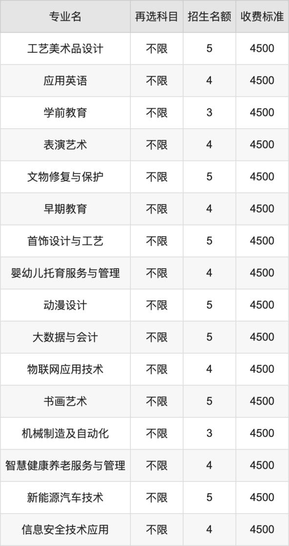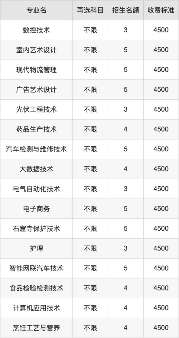 蘭州職業(yè)技術(shù)學(xué)院物理組高職??婆鶵段共計(jì)56個(gè)招生專業(yè),各專業(yè)每年的學(xué)費(fèi)是4500元。