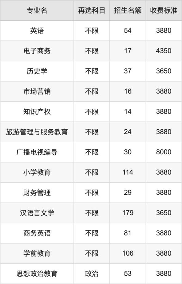萍鄉(xiāng)學(xué)院在歷史組本科批招生的各個(gè)專業(yè),每年的學(xué)費(fèi)是3650元-8000元。招生人數(shù)最多的專業(yè)是漢語(yǔ)言文學(xué),2024年招179人,學(xué)費(fèi)是3650元。