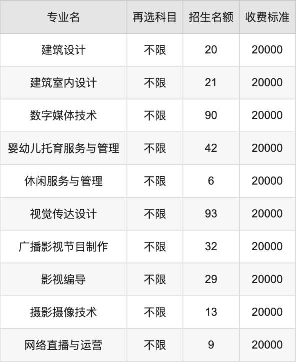 南京視覺藝術(shù)職業(yè)學(xué)院物理組??婆灿?jì)9個招生專業(yè),各專業(yè)每年的學(xué)費(fèi)是20000元。