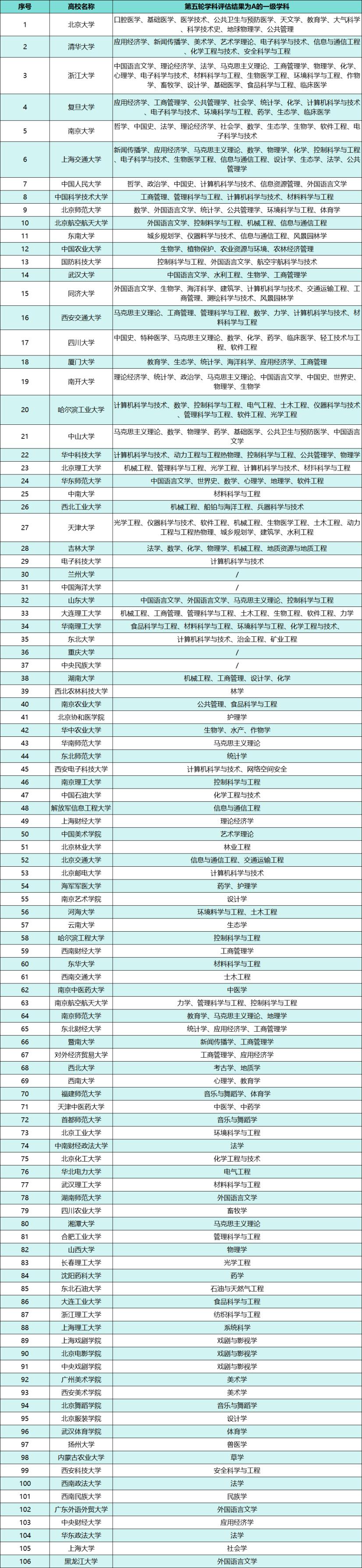 (二)第五輪學(xué)科評(píng)估結(jié)果為A的大學(xué)及學(xué)科名單
