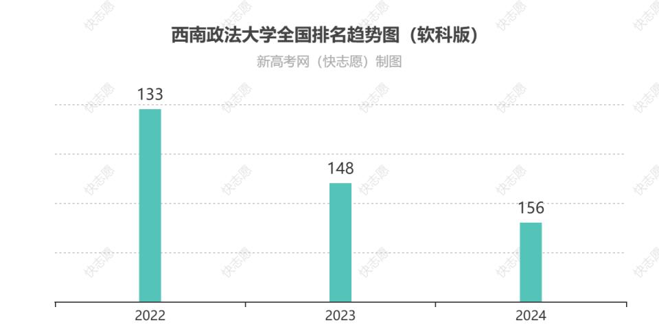 從歷年排名變化趨勢(shì)圖可見:西南政法大學(xué)在全國(guó)排名2024為第156位、2023為第148位、2022為第133位,最近兩年排名呈下降趨勢(shì),綜合實(shí)力有所減弱。