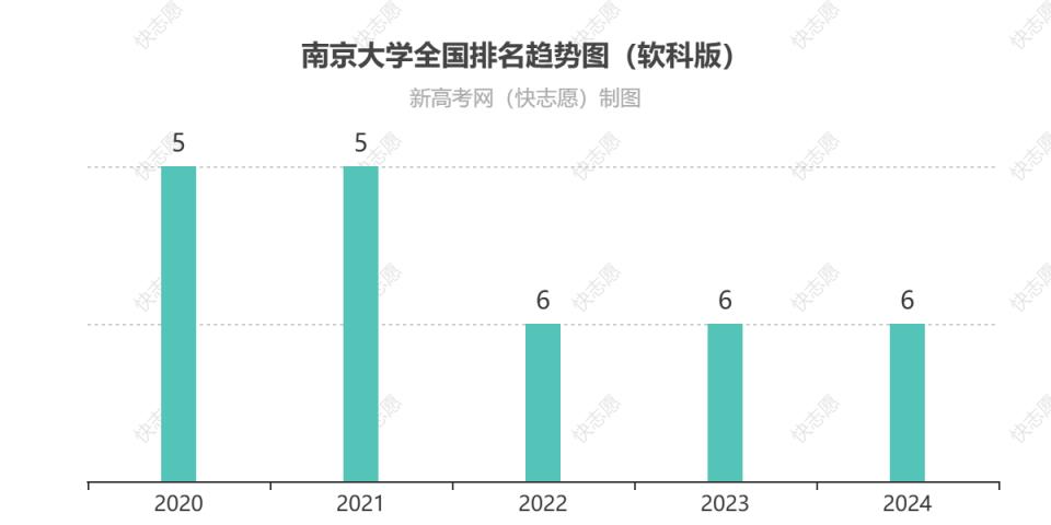 從歷年排名變化趨勢圖可見:南京大學(xué)在全國排名2024為第6位、2023為第6位、2022為第6位、2021為第5位、2020為第5位,最近兩年排名相對穩(wěn)定。