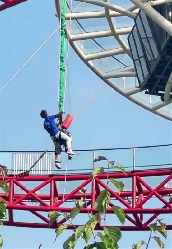 現(xiàn)場視頻顯示,一名身穿藍(lán)色上衣的男子穿戴蹦極裝備,橫躺著懸掛在半空中,另一名同樣穿藍(lán)色上衣的男子身穿裝備使用繩索滑降到橫躺半空中的男子身旁,并將其抱起,后繩索被緩緩拉起。視頻發(fā)布者配文稱:“蹦極蹦暈了?!?/strong>位置信息顯示為合肥市廬江縣冶父山鎮(zhèn)逍遙谷高空樂園。