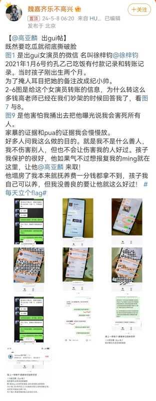 據(jù)女演員魏嘉爆料,高亞麟與她是男女朋友未婚生孩子的關(guān)系,女方發(fā)現(xiàn)高亞麟孕期出軌、產(chǎn)后包養(yǎng)女演員后斷了結(jié)婚登記的心思。而此番爆料也是被高亞麟強(qiáng)力威脅之后的反抗,不得不控訴高亞麟家暴等劣行達(dá)到魚死網(wǎng)破的目的。