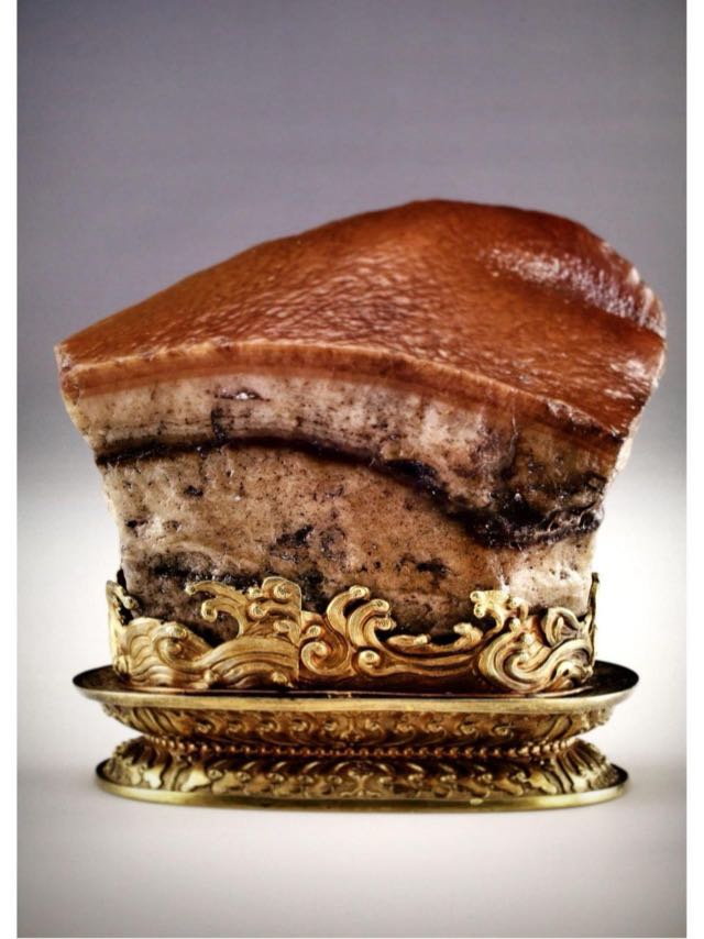 東坡肉石與翠玉白菜、毛公鼎并稱臺北故宮博物院的 “鎮(zhèn)館三寶”,它是一塊瑪瑙石,出自內(nèi)蒙阿拉善左旗,清康熙時供入內(nèi)府。這塊肉形石的形狀、色澤、紋理都栩栩如生,仿佛一塊真實的紅燒肉,讓人不禁垂涎欲滴?!叭狻?的肥瘦層次分明、肌理清晰、毛孔宛然,無論是色彩還是紋理,都可以亂真。
