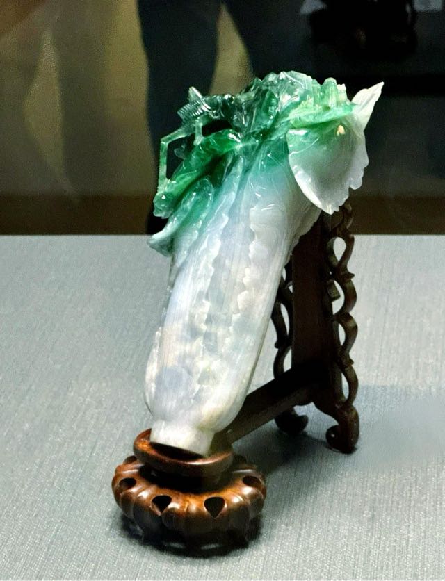 翠玉白菜是清代中后期的翡翠雕刻品,長 18.7 厘米、寬 9.1 厘米、厚 (高) 5.07 厘米,由一塊半灰白、半翠綠的翡翠玉石雕琢而成。匠人巧妙地運(yùn)用玉石天然的顏色變化,將灰白色部分雕刻成菜幫,綠色部分雕刻成菜葉,而綠色玉料的瑕疵部分則雕刻成趴在菜葉上的螽斯和蝗蟲兩只小昆蟲。#愛丁堡旅游攻略#翠玉白菜整體造型包心、無根、莖葉脆嫩、葉青莖白,生動而又逼真。